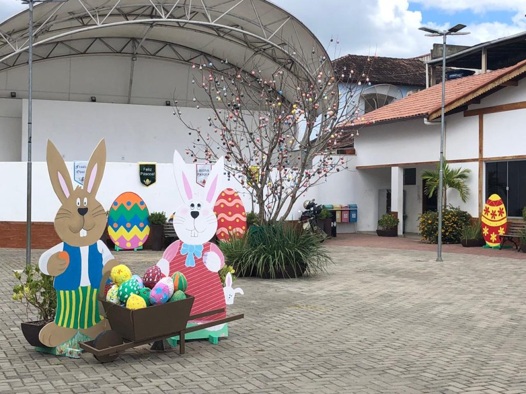 A Praça do Colono, localizada no centro de Vila Pavão, recebeu, na última sexta-feira (24), decoração especial para a Páscoa, com elementos decorativos produzidos pela equipe da Secretaria Municipal de Cultura e Turismo e outros colaboradores.