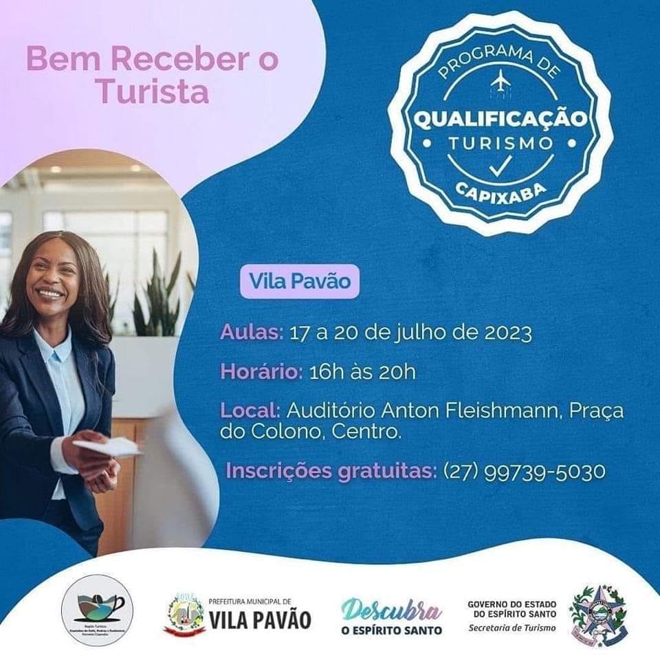 As vagas disponíveis para Vila Pavão são para o curso Bem Receber o Turista que acontecerá entre os dias 17 a 20 de julho, das 16h às 20h, no auditório Anton Fleishmann, Praça do Colono, Centro, Vila Pavão. Mais informações podem ser obtidas pelo telefone (27) 99937-7614.